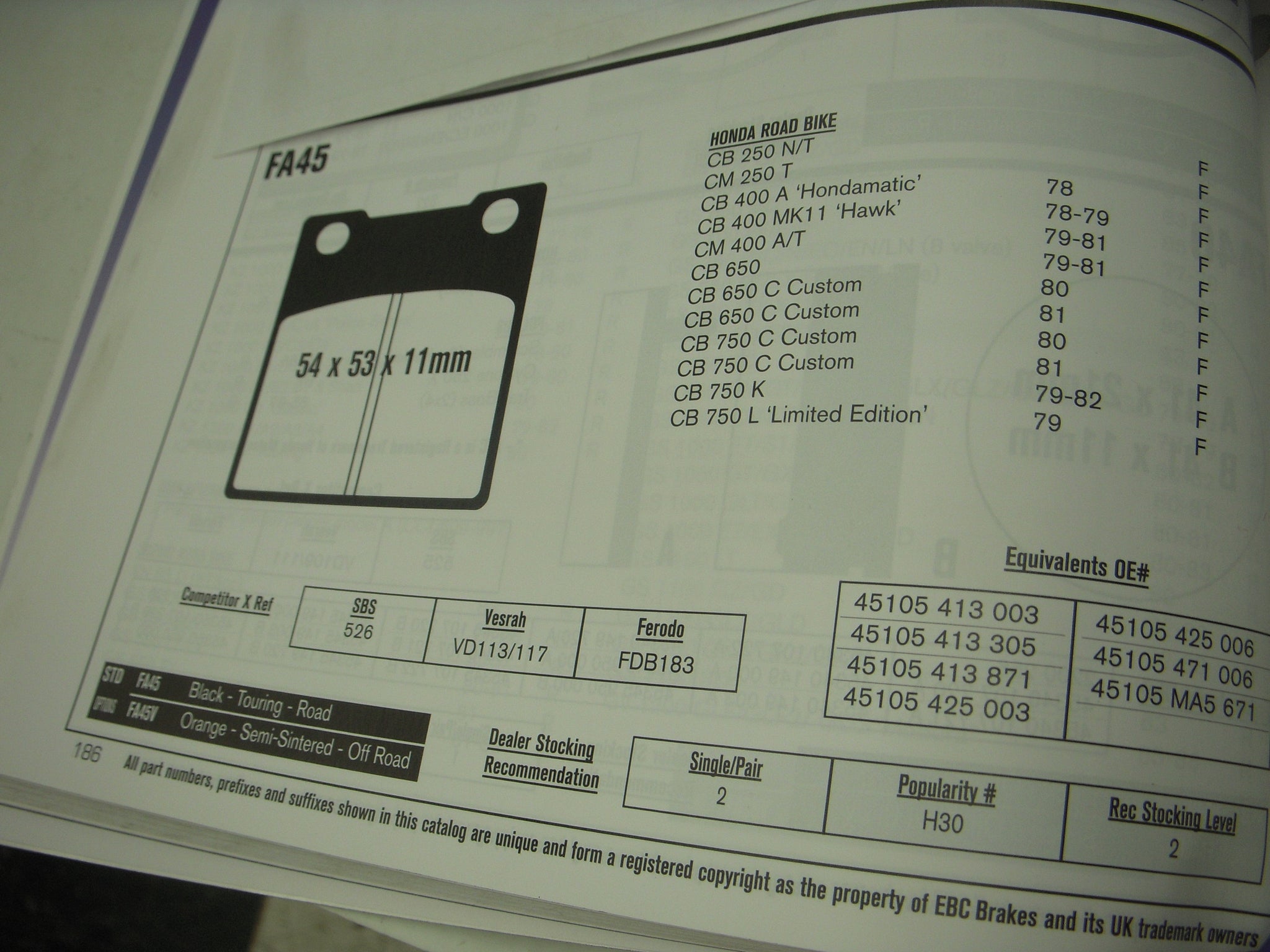 FA45 HONDA CB250 CM250 CB400 CB650 CB750 EBC Brake Disc Pads NEW (M44-43)