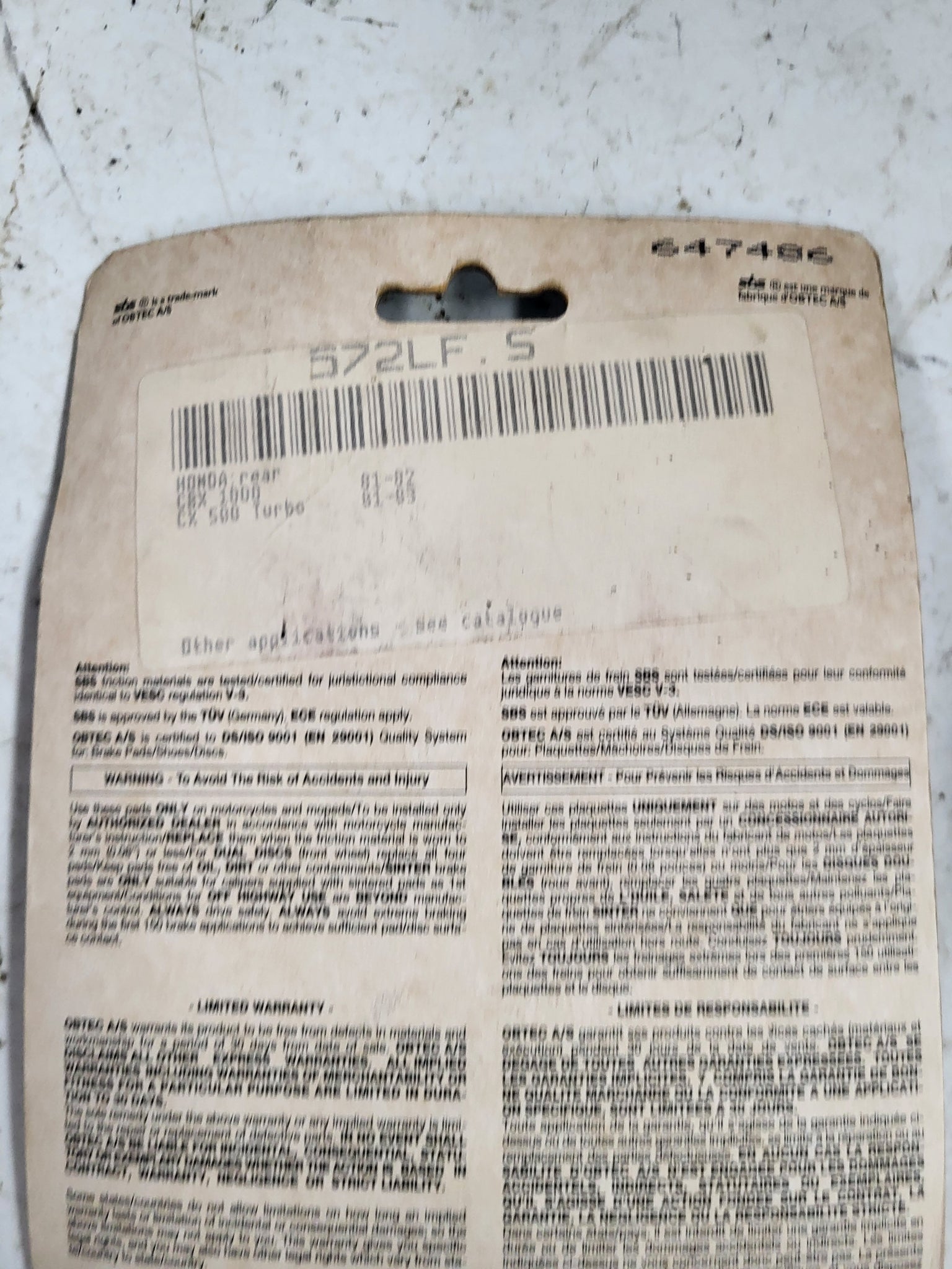 572LF REAR SBS Brake Disc Pad Set NEW HONDA CX500 TURBO CBX (R3-ENDCAP)