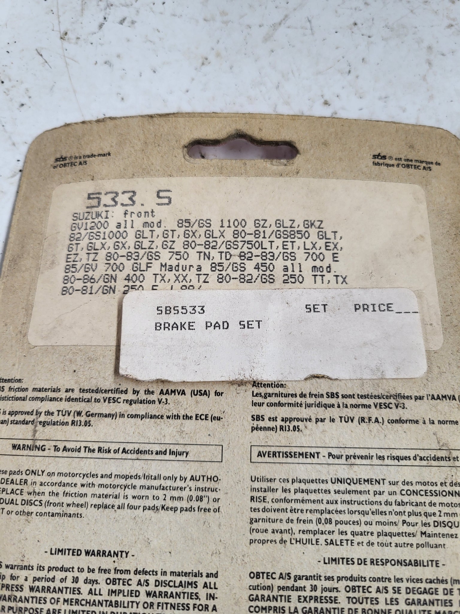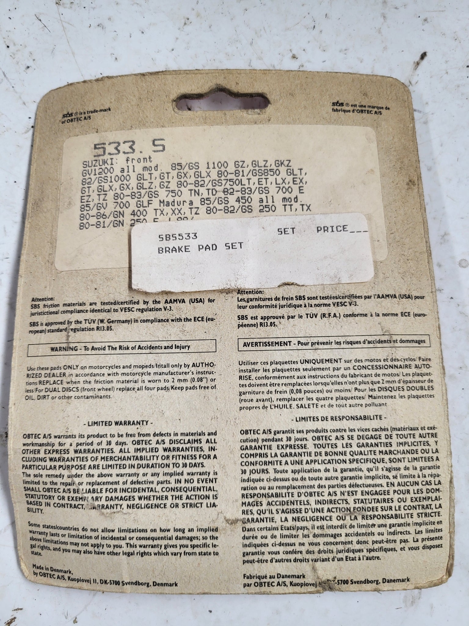 533HF FRONT SBS Brake Disc Pad Set NEW SUZUKI GS100 GN250 GN125 GV700 (R3-ENDCAP)